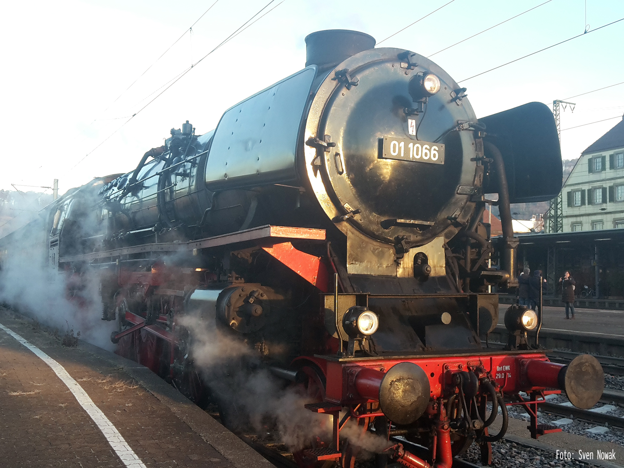 Die Wintersonne am kalten 10. Dezember 2016 gibt einen goldenen Schimmer auf die 01 1066. Foto: Sven Nowak